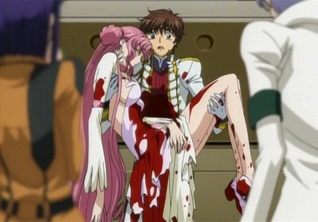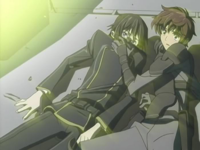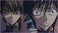 Suzaku erhält den Befehl Lelouch zu erschießen, jedoch widersetzt er sich diesem. Daraufhin schießt sein Kommandant auf Suzaku.Lelouch und C.C konnten ein Stück fliehen.Als ein weiterer Kommandant auf Lelouch schießte stellt sich aber C.C. dem Schuss in den Weg und wird an Lelouchs Stelle getroffen. Für Lelouch ist die Lage aussichtslos und er wünscht sich nur lebend aus der Sache heraus zu kommen.