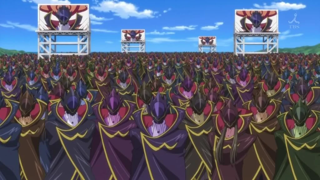 Wieder realisiert er, dass seine Mission nicht mehr nur für Nunnally gedacht ist, sondern auch für das gesamte japanische Volk. Lelouch, getarnt als Zero, willigt ein ihren Plan zu unterstützen, er stellt sich sogar bereit 1 Millionen Beführworter zu finden, wenn er dafür nur ins Exil verbannt wird. Bei der Eröffnung der Japanzone sind tatsächlich 1 Millionen Bürger gekommen. Als die Verbannung von Zero bekannt gegeben wird, steigt Rauch über die Bevölkerungsmasse auf und es stehen nun 1 Millionen Zero's da, welche alle nun ins Ausland verbannt worden sind, dies war der Plan von Lelouch.