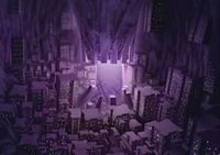 La mayor parte de la ciudad se enciende con un resplandor púrpura misterioso que emane de un elevador del pensamiento en la cabeza de la ciudad.