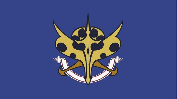 The Britannian flag resembles the St. George's Cross, the flag of England, warped with the Union Flag of the United Kingdom. It bears a unique coat of arms. On the coat of arms, the lion represents royalty (or the Emperor) while the serpent represents "death and rebirth". As this is a fantasy flag and accompanying coat of arms, some liberties have been taken with the heraldic rules. The green leaves that comprise the mantling are both colors, which is a breach of the rule that color may only meet metal. The rule has it that the color is—unless the opposite is specified—always on the outside and the metal on the inside, while two colors may never meet even in the mantling. A counterargument to this breach could be that leaves are naturally green, and hence they are "proper". The use of a properly colored charge meeting another color is a commonly accepted exception to the no color on color rule. This exception does not occur in reality where it concerns the mantling. Furthermore, the escutcheon shape shown has never been used for coats of arms; the closest match would be an "Old French" shape within a heraldic console.